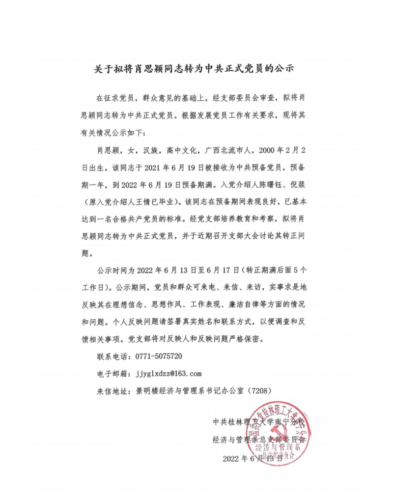 关于拟将肖思颖同志转为中共正式党员的公示