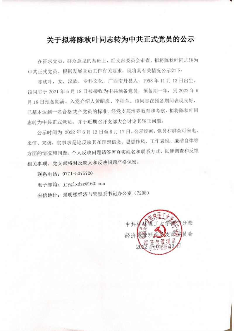 关于拟将陈秋叶同志转为中共正式党员的公示