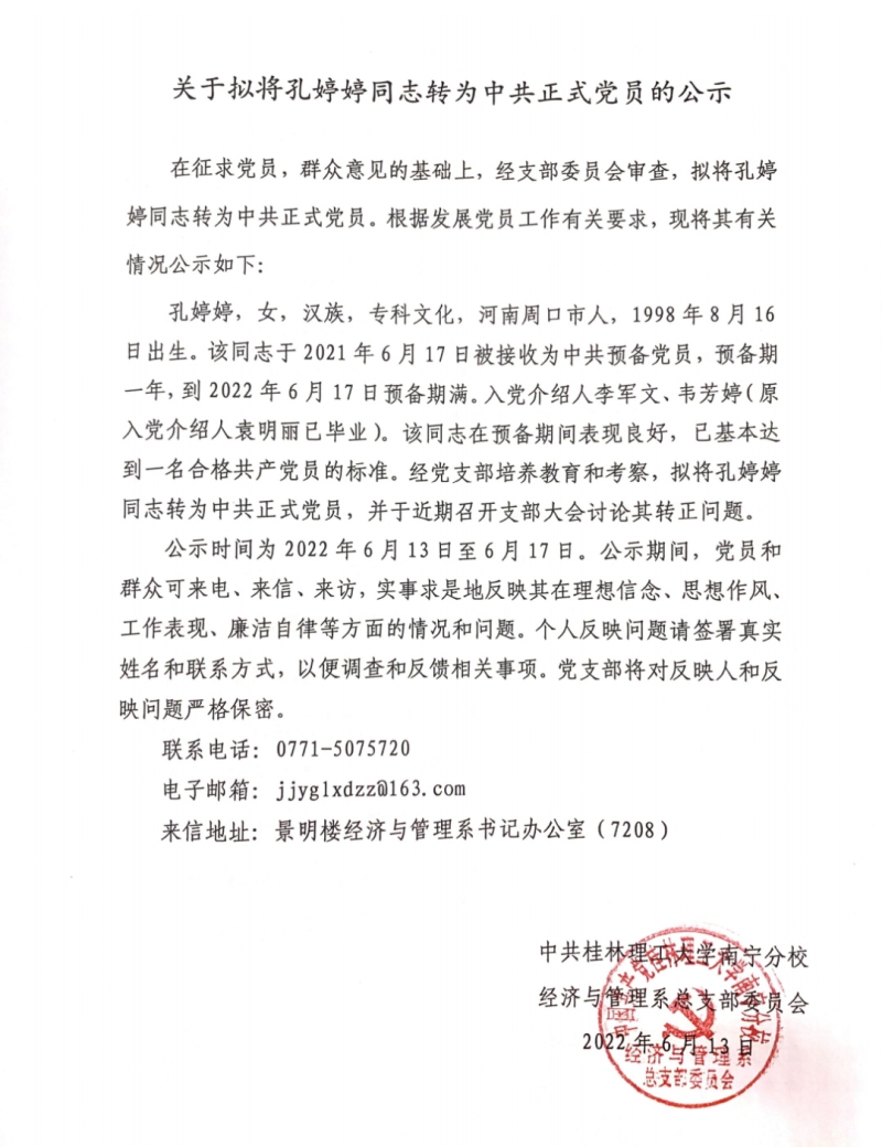 关于拟将孔婷婷同志转为中共正式党员的公示