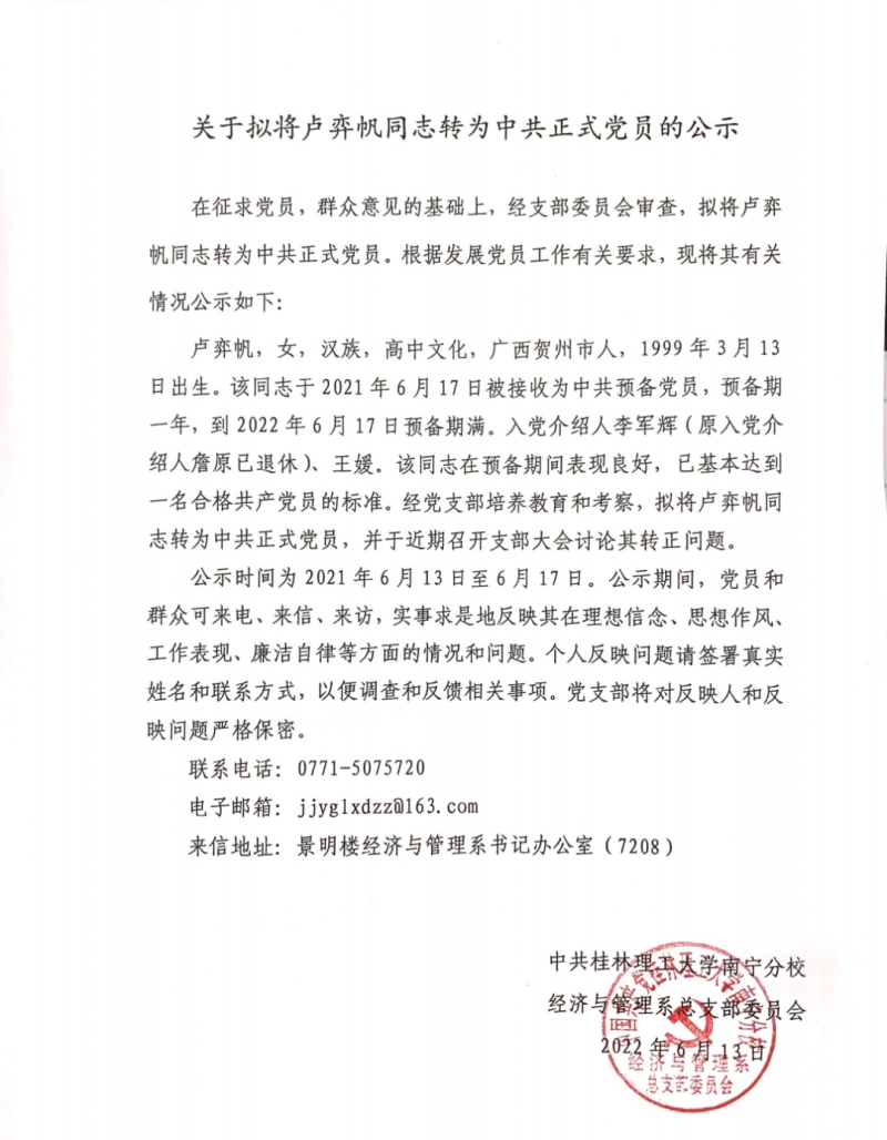 关于拟将卢弈帆同志转为中共正式党员的公示
