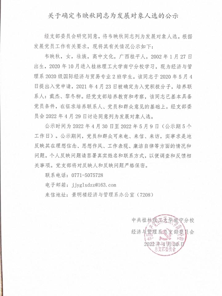 关于确定韦映秋同志为发展对象人选的公示