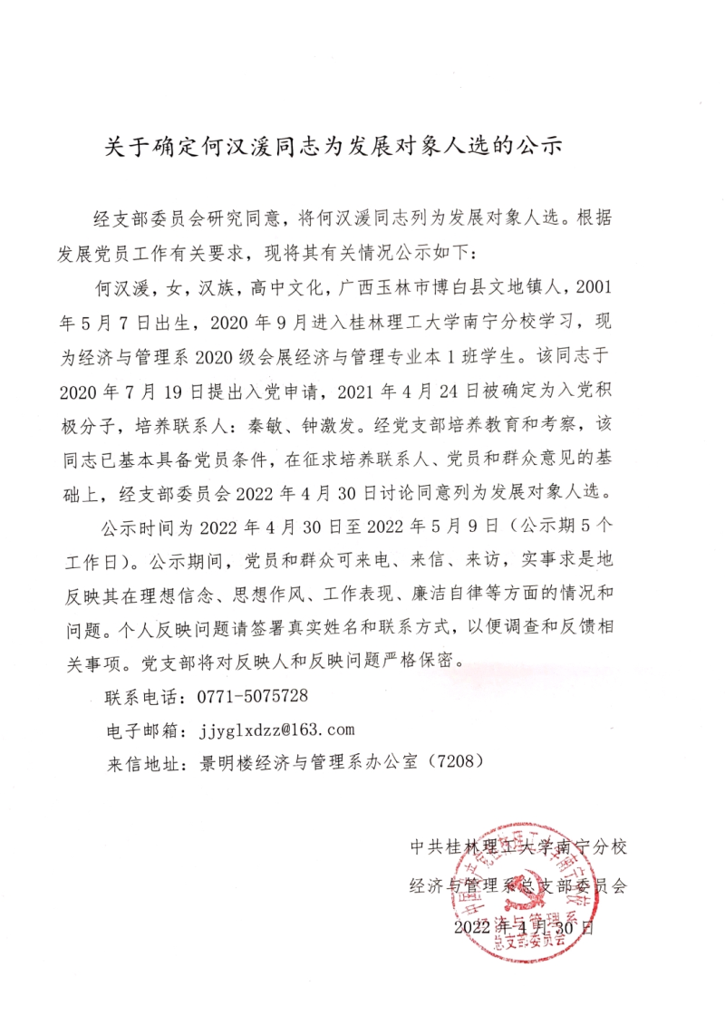 关于确定何汉湲同志为发展对象人选的公示