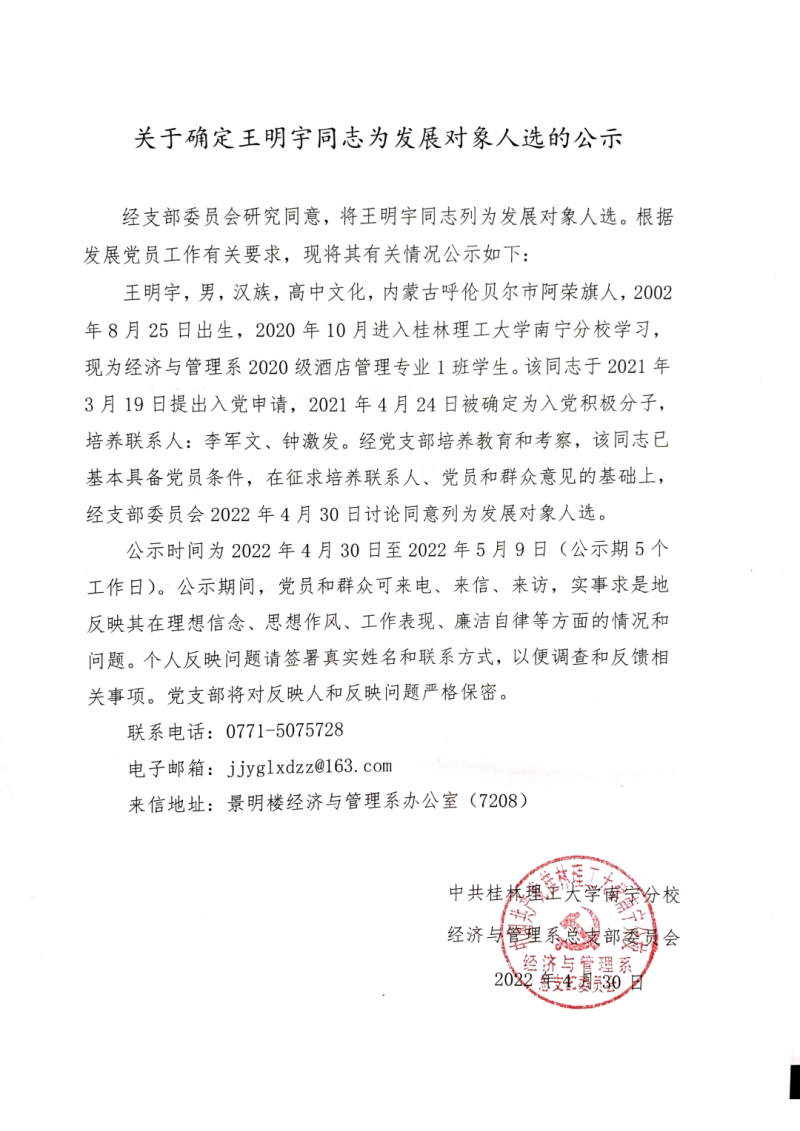 关于确定王明宇同志为发展对象人选的公示