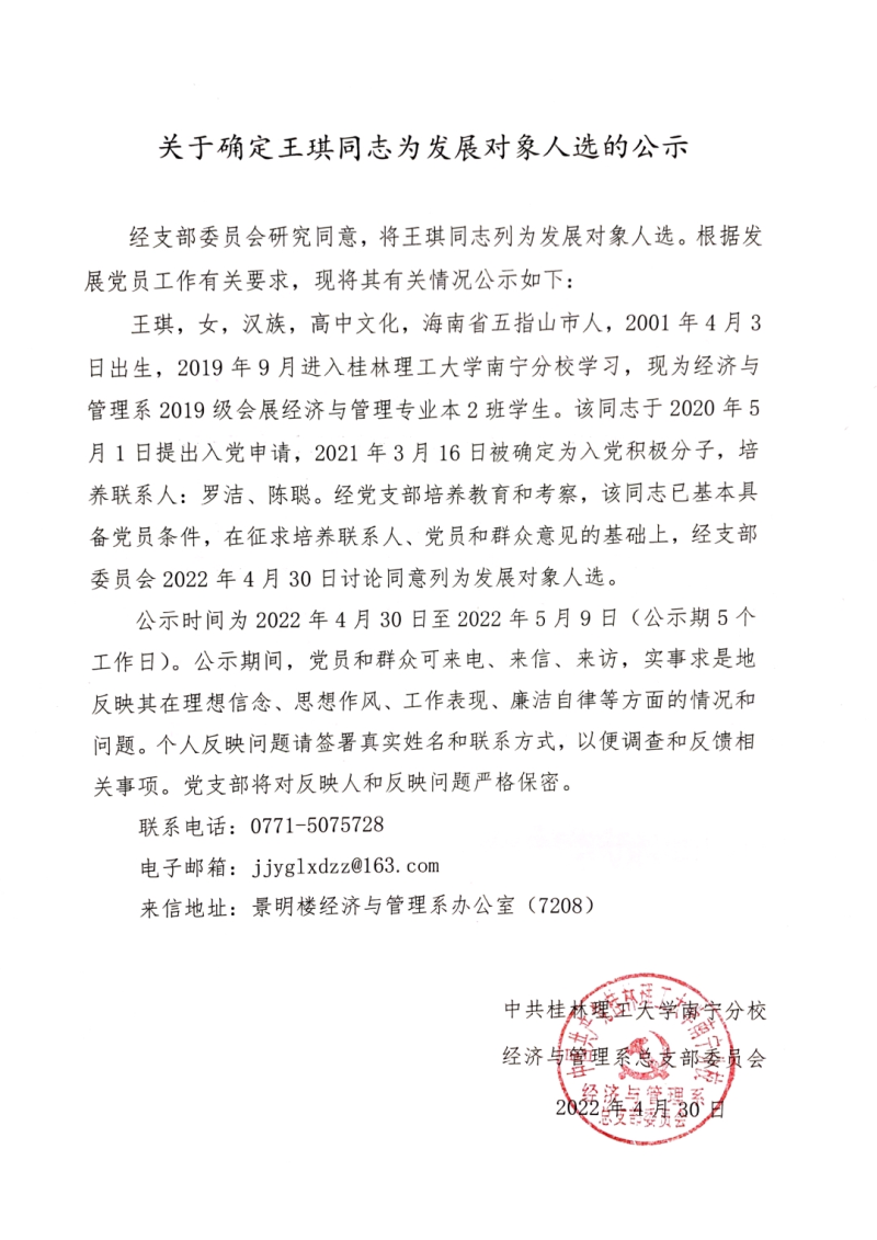 关于确定王琪同志为发展对象人选的公示