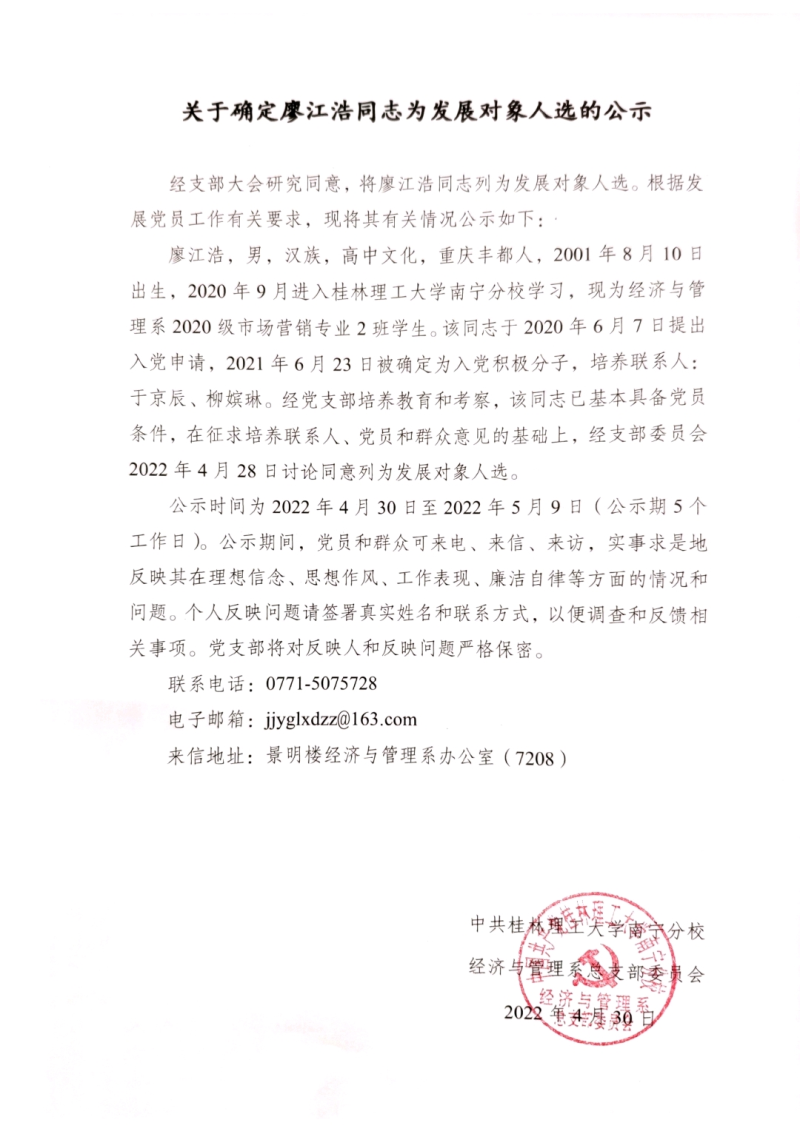 关于确定廖江浩同志为发展对象人选的公示