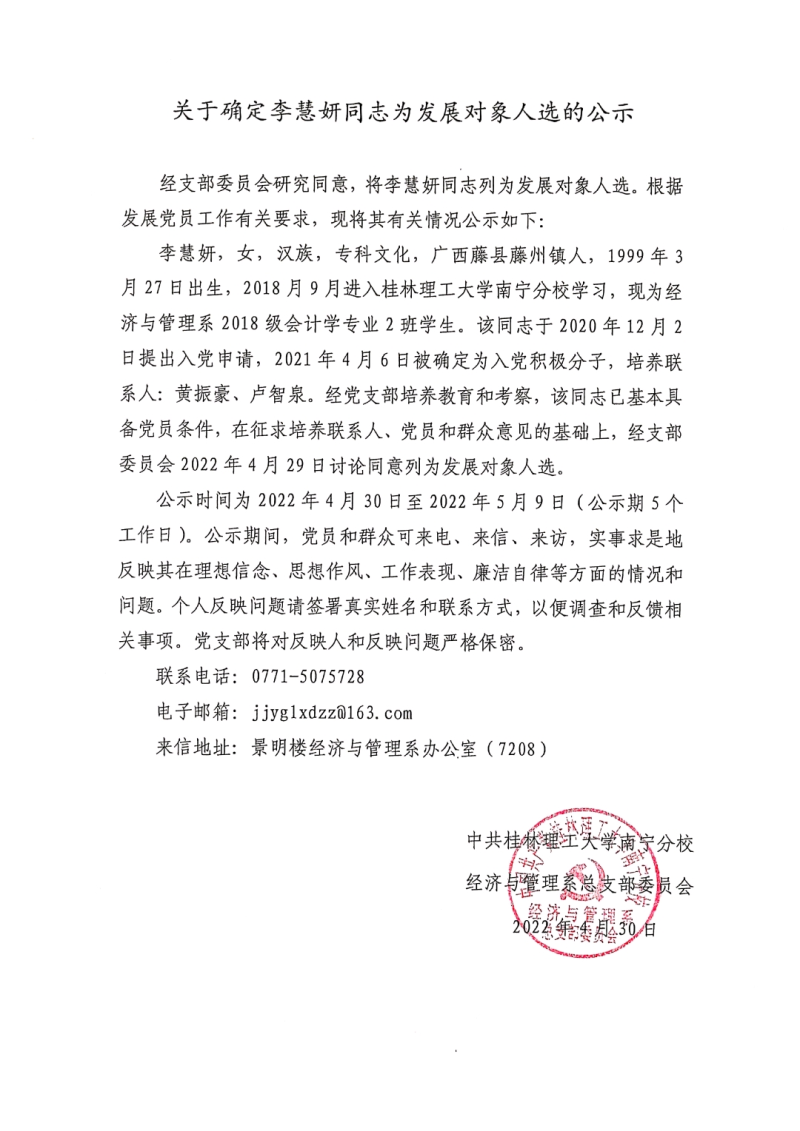 关于确定李慧妍同志为发展对象人选的公示