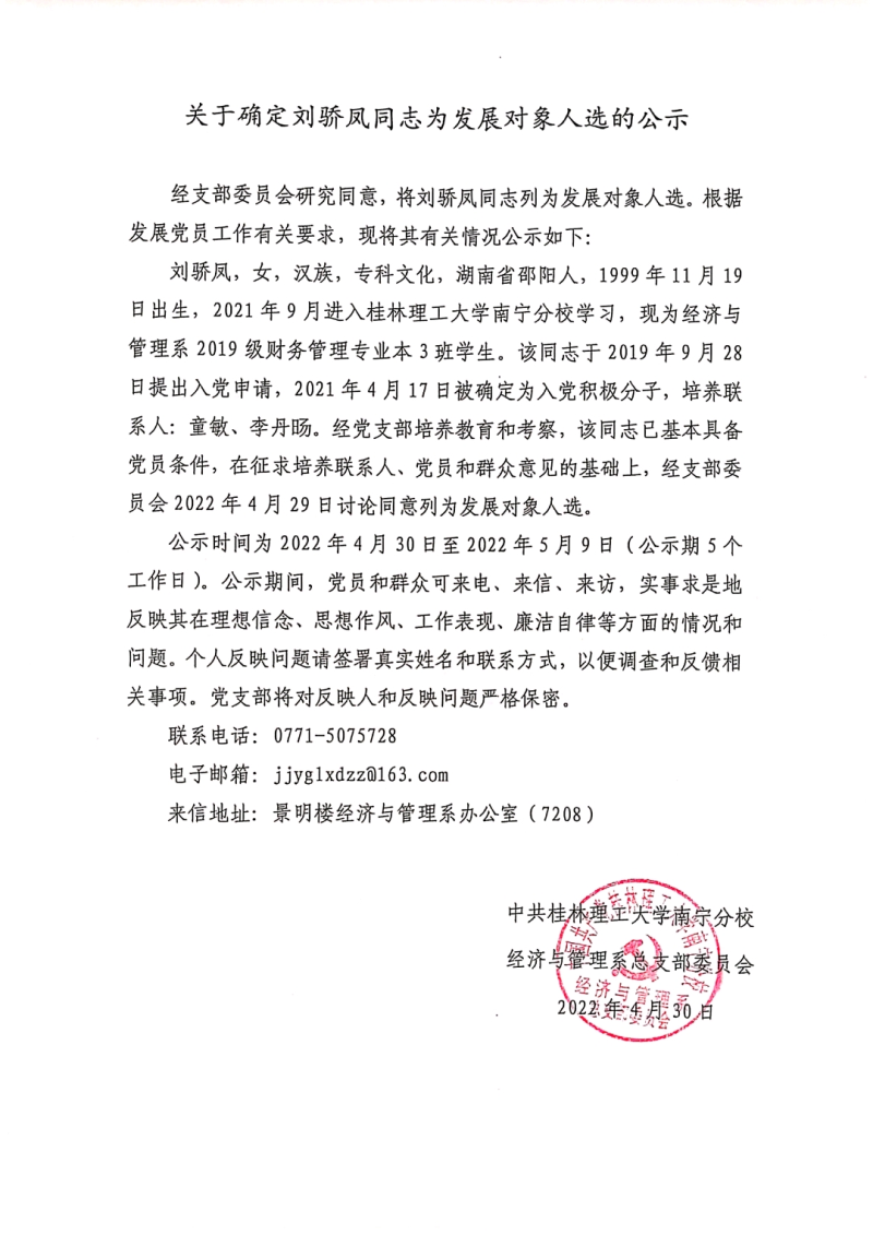关于确定刘骄凤同志为发展对象人选的公示