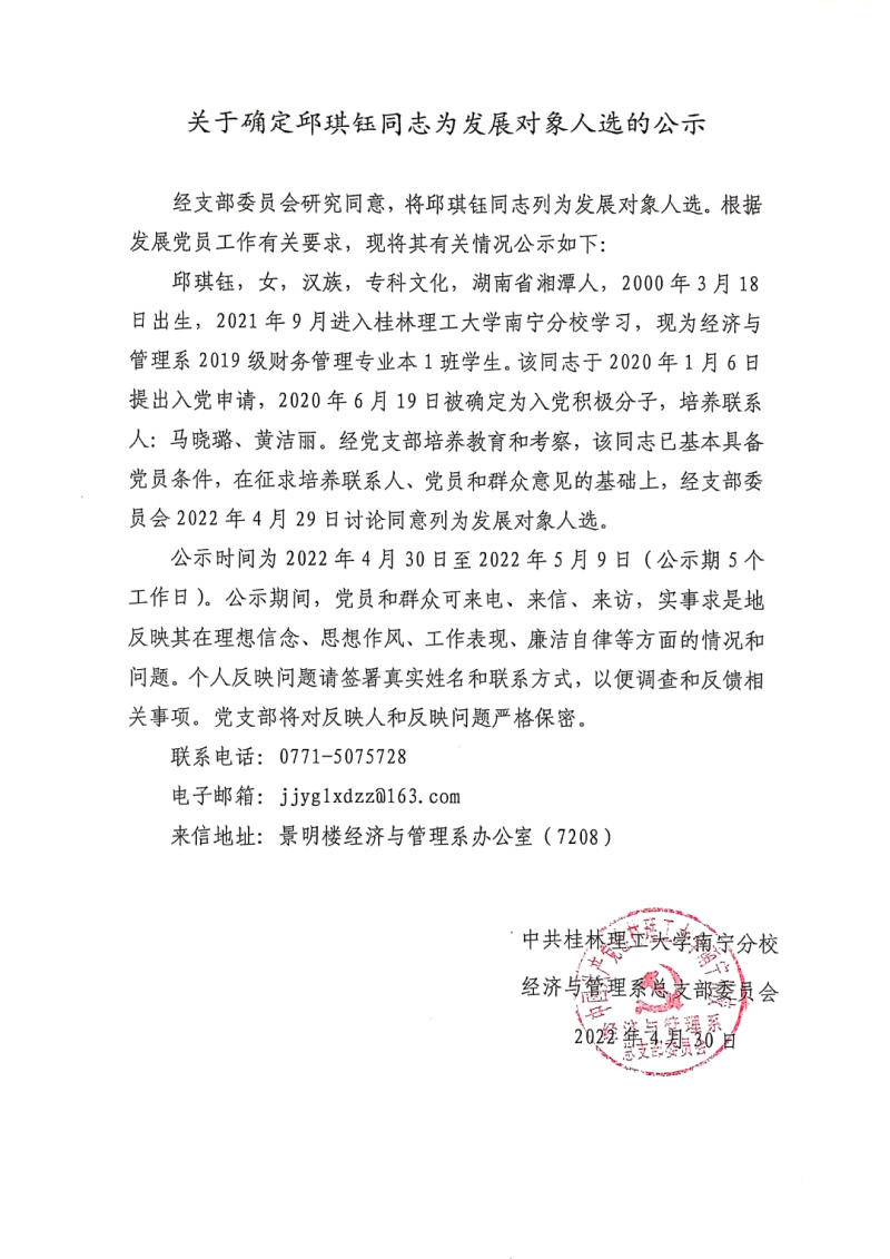 关于确定邱琪钰同志为发展对象人选的公示