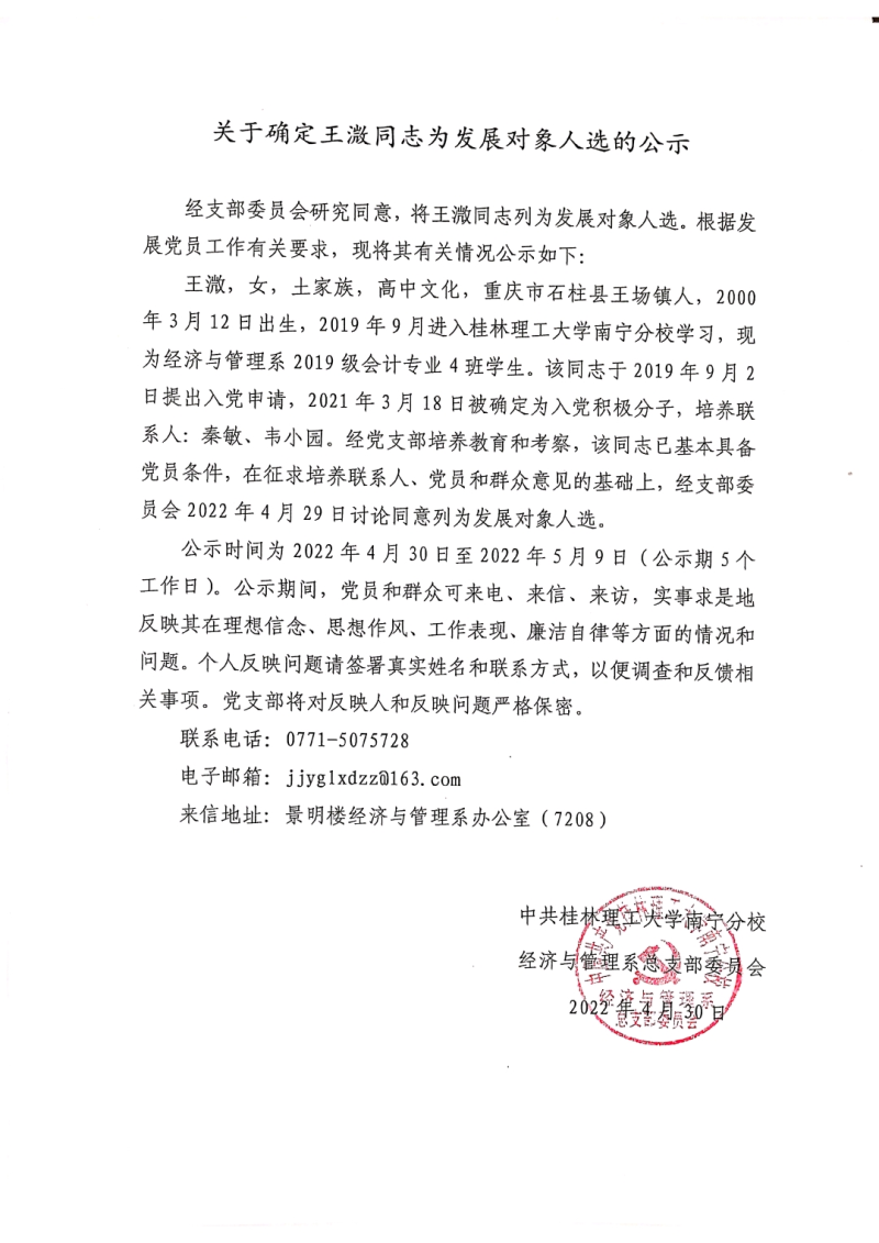 关于确定王溦同志为发展对象人选的公示