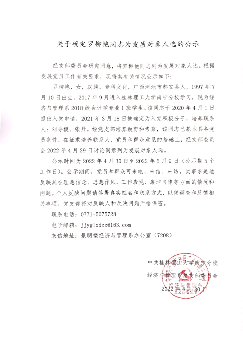 关于确定罗柳艳同志为发展对象人选的公示