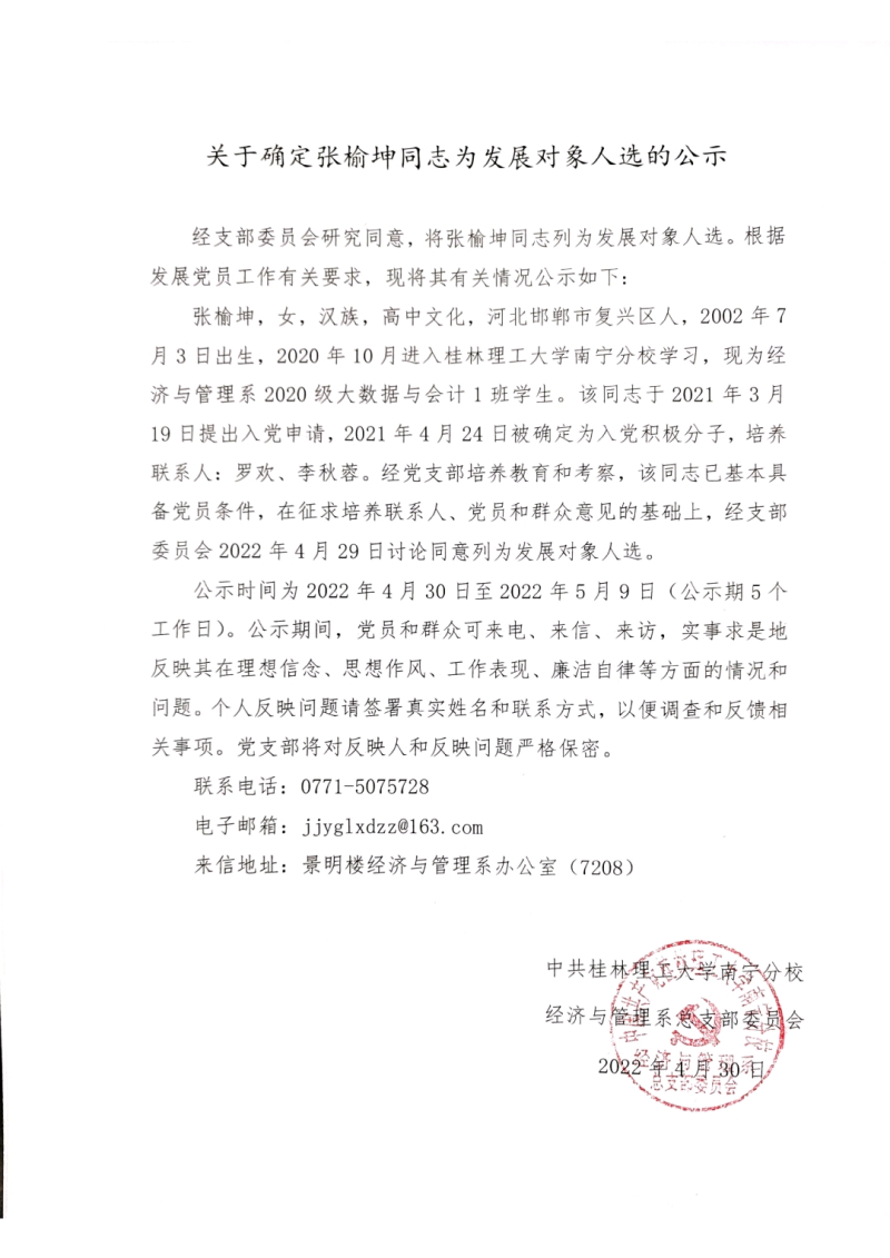 关于确定张榆坤同志为发展对象人选的公示