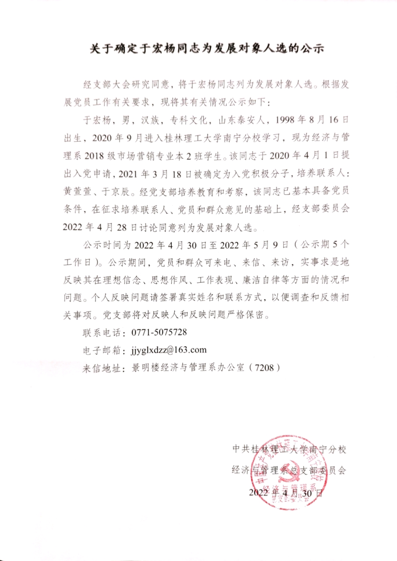 关于确定于宏杨同志为发展对象人选的公示