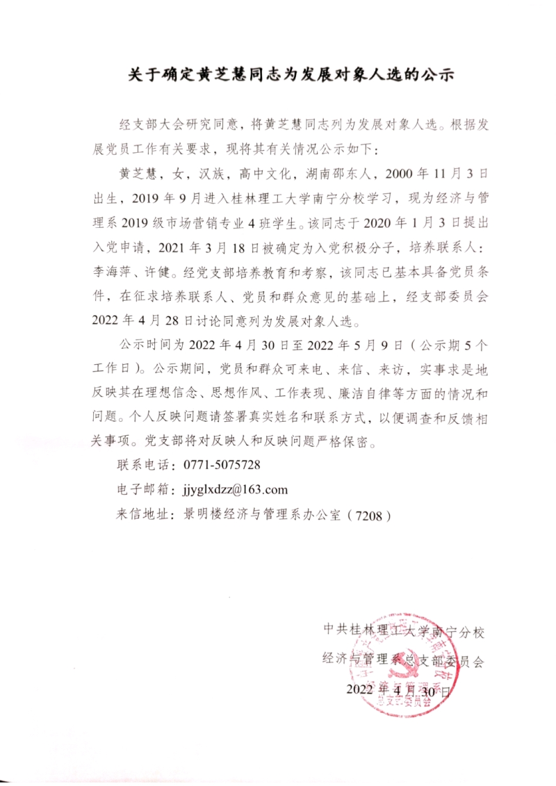 关于确定黄芝慧同志为发展对象人选的公示