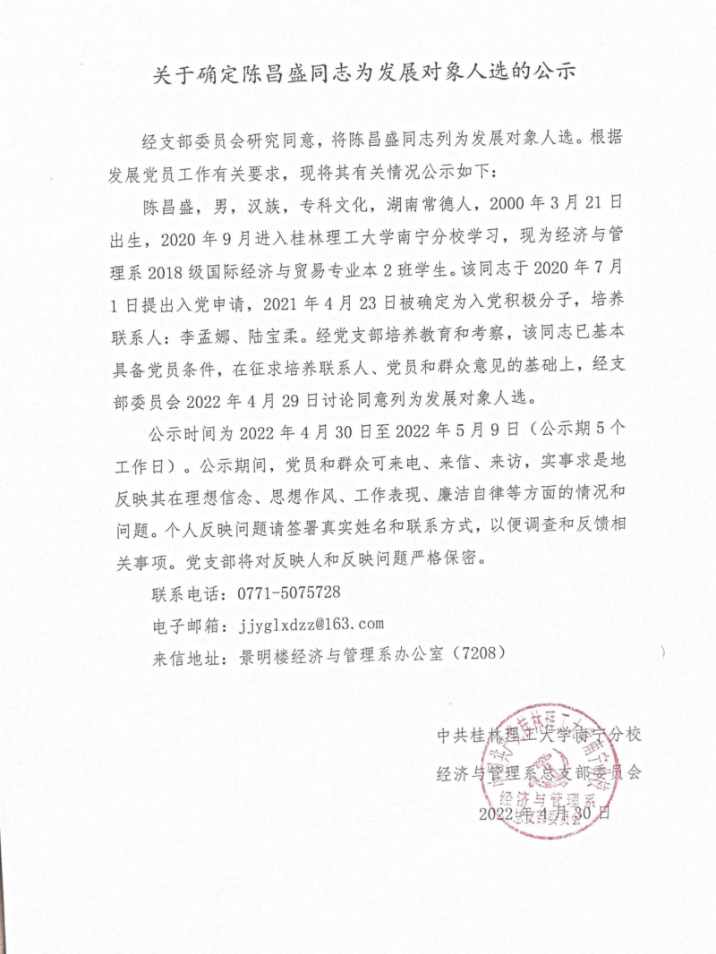 关于确定陈昌盛同志为发展对象人选的公示