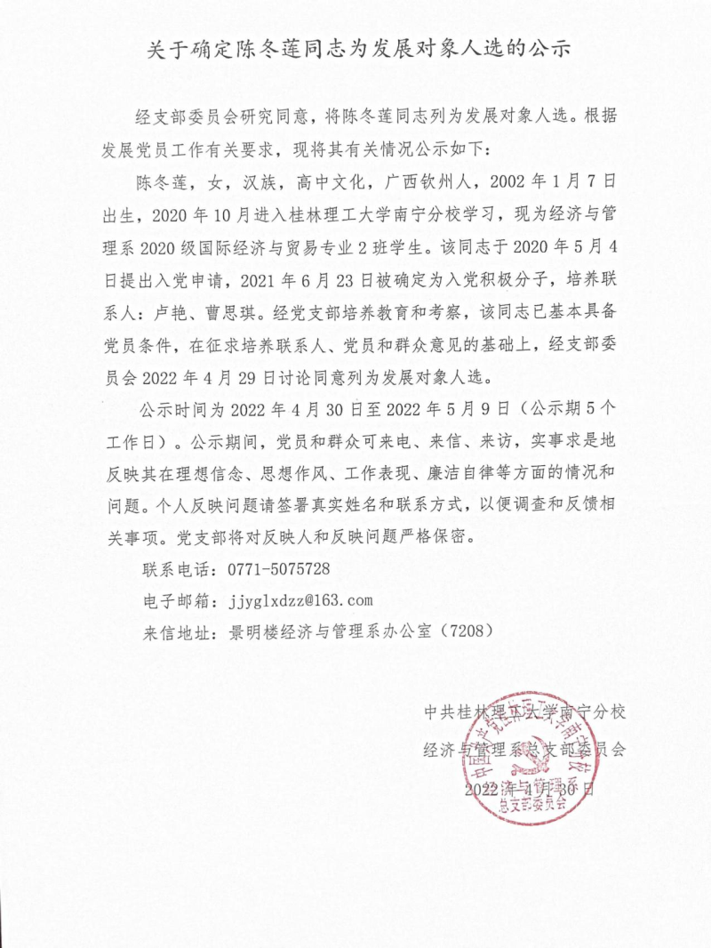 关于确定陈冬莲同志为发展对象人选的公示
