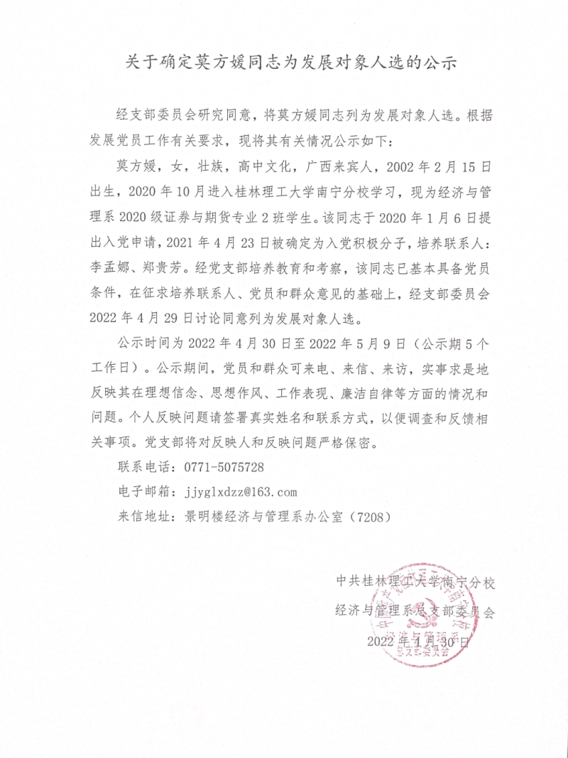 关于确定莫方媛同志为发展对象人选的公示