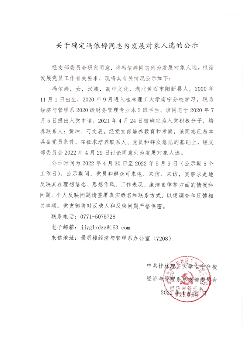 关于确定冯依婷同志为发展对象人选的公示