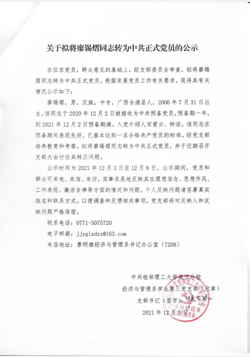 关于拟将廖锡熠同志转为中共正式党员的公示