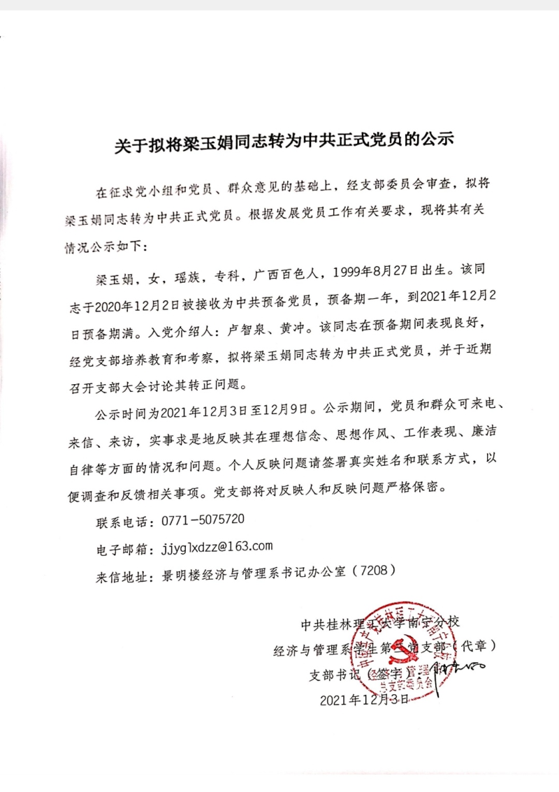 关于拟将梁玉娟同志转为中共正式党员的公示