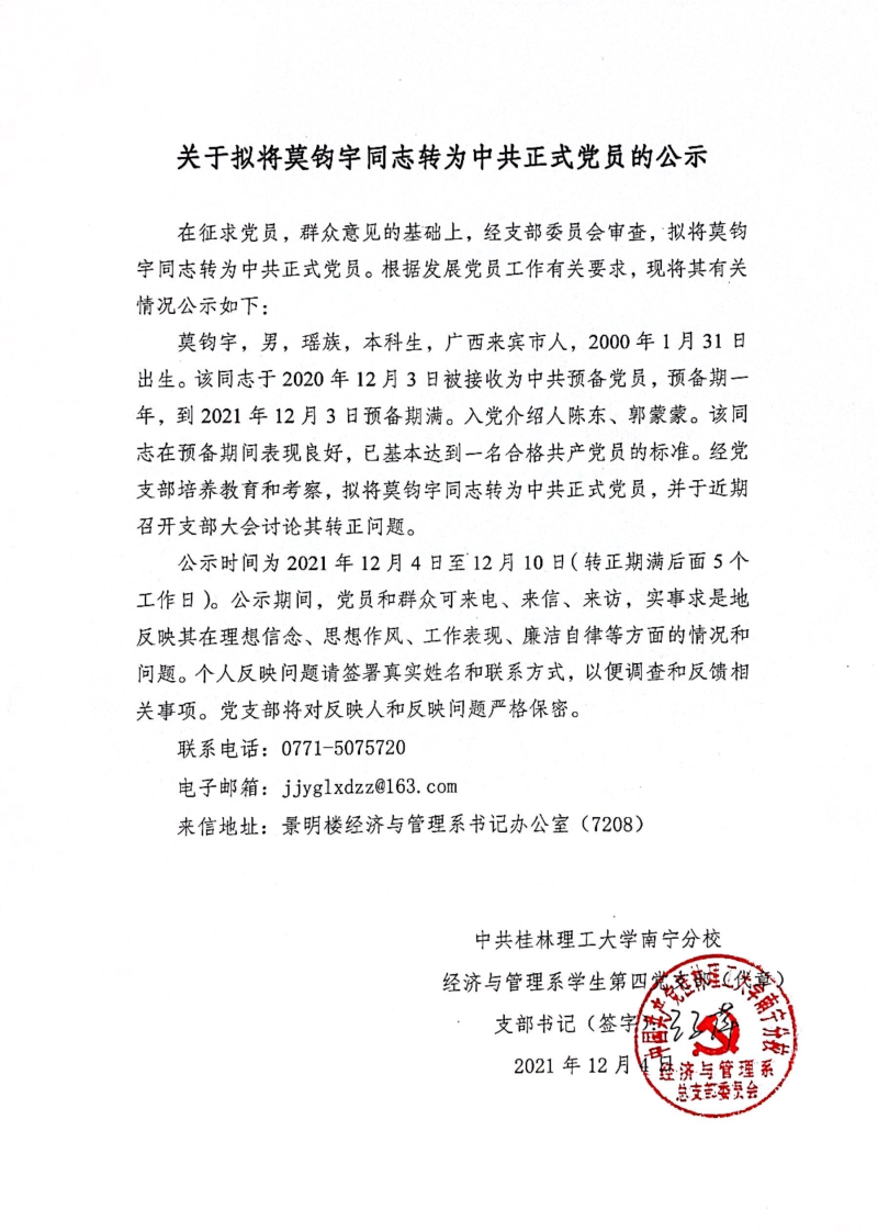 关于拟将莫钧宇同志转为中共正式党员的公示