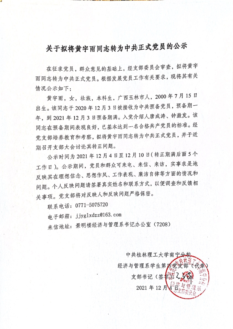 关于拟将黄宇雨同志转为中共正式党员的公示