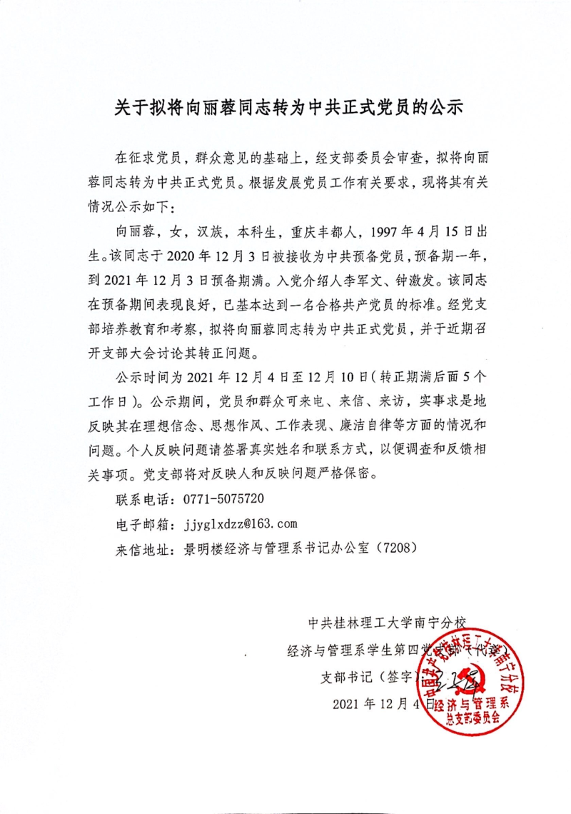 关于拟将向丽蓉同志转为中共正式党员的公示