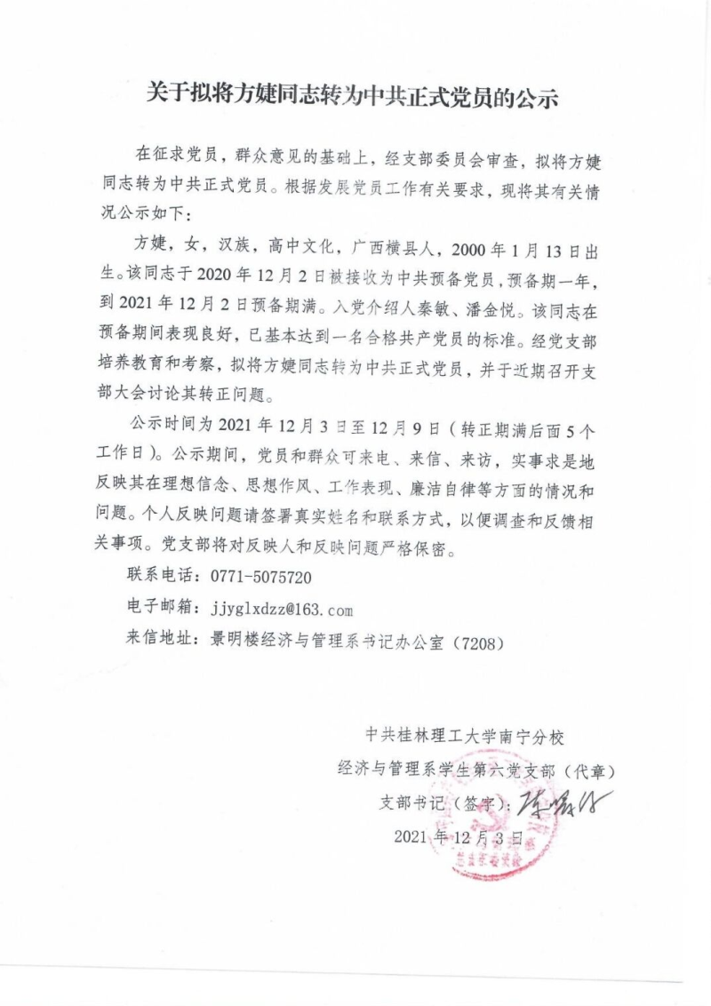 关于拟将方婕同志转为中共正式党员的公示