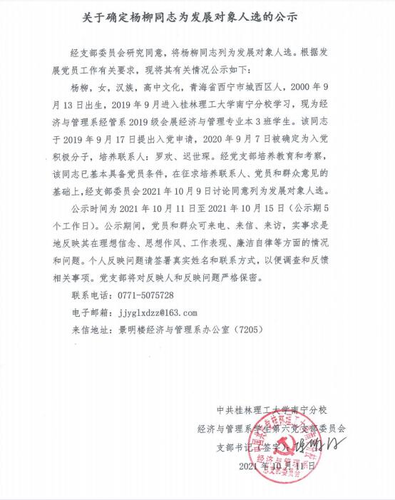 关于确定杨柳同志为发展对象人选的公示