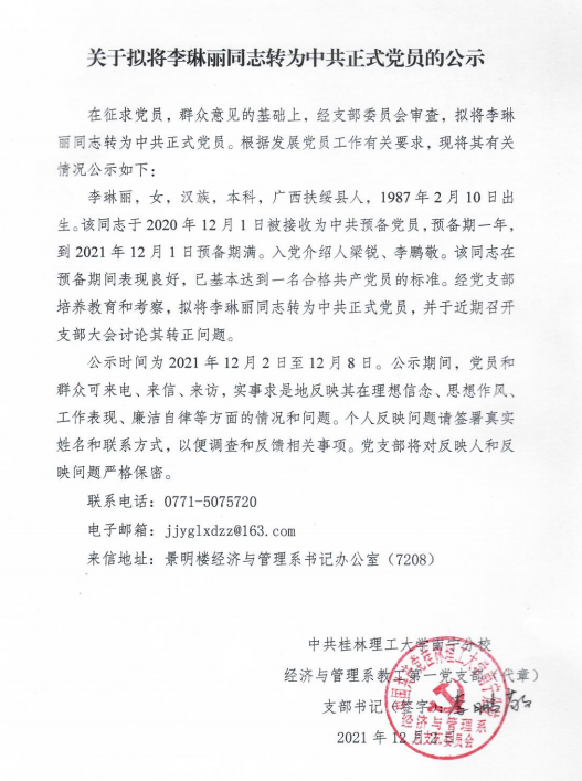关于拟将李琳丽同志转为正式党员的公示