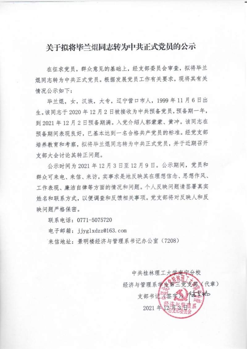 关于拟将毕兰琨同志转为中共正式党员的公示