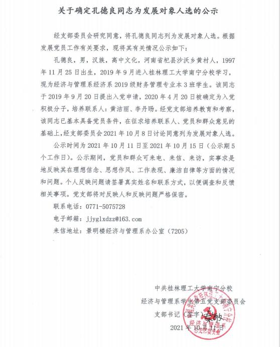 关于确定孔德良同志为发展对象人选的公示