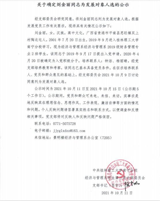 关于确定刘金丽同志为发展对象人选的公示