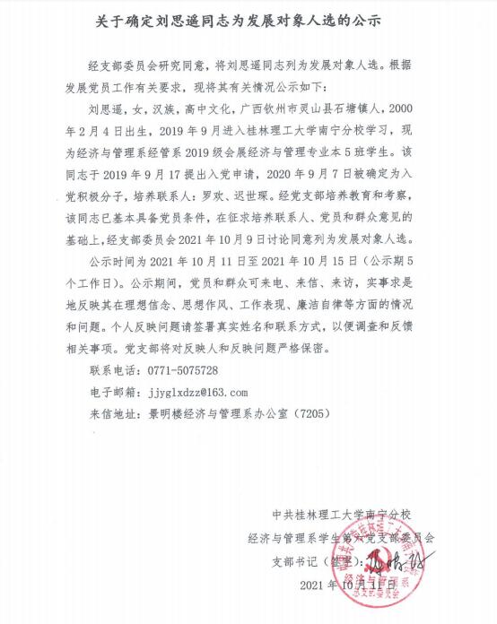 关于确定刘思遥同志为发展对象人选的公示