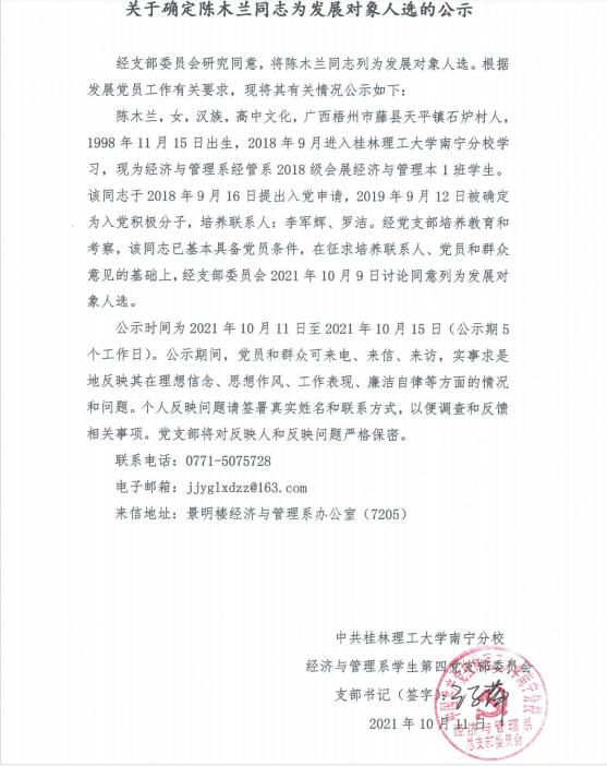 关于确定陈木兰同志为发展对象人选的公示
