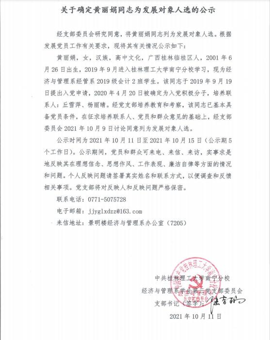 关于确定黄丽娟同志为发展对象人选的公示