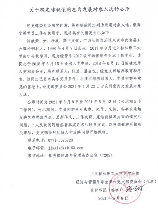 经济与管理系学生第六党支部关于确定陈献荣同志为发展对象入选的公示