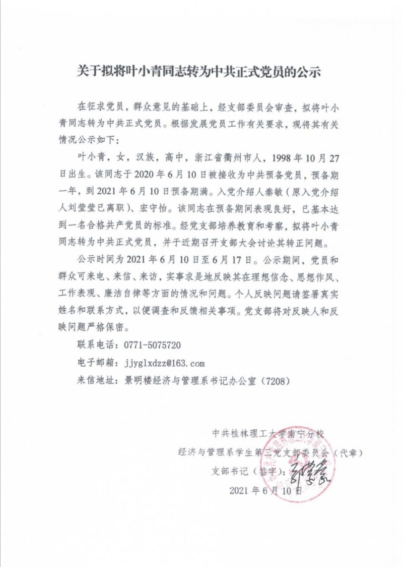 关于拟将叶小青同志转为中共正式党员的公示