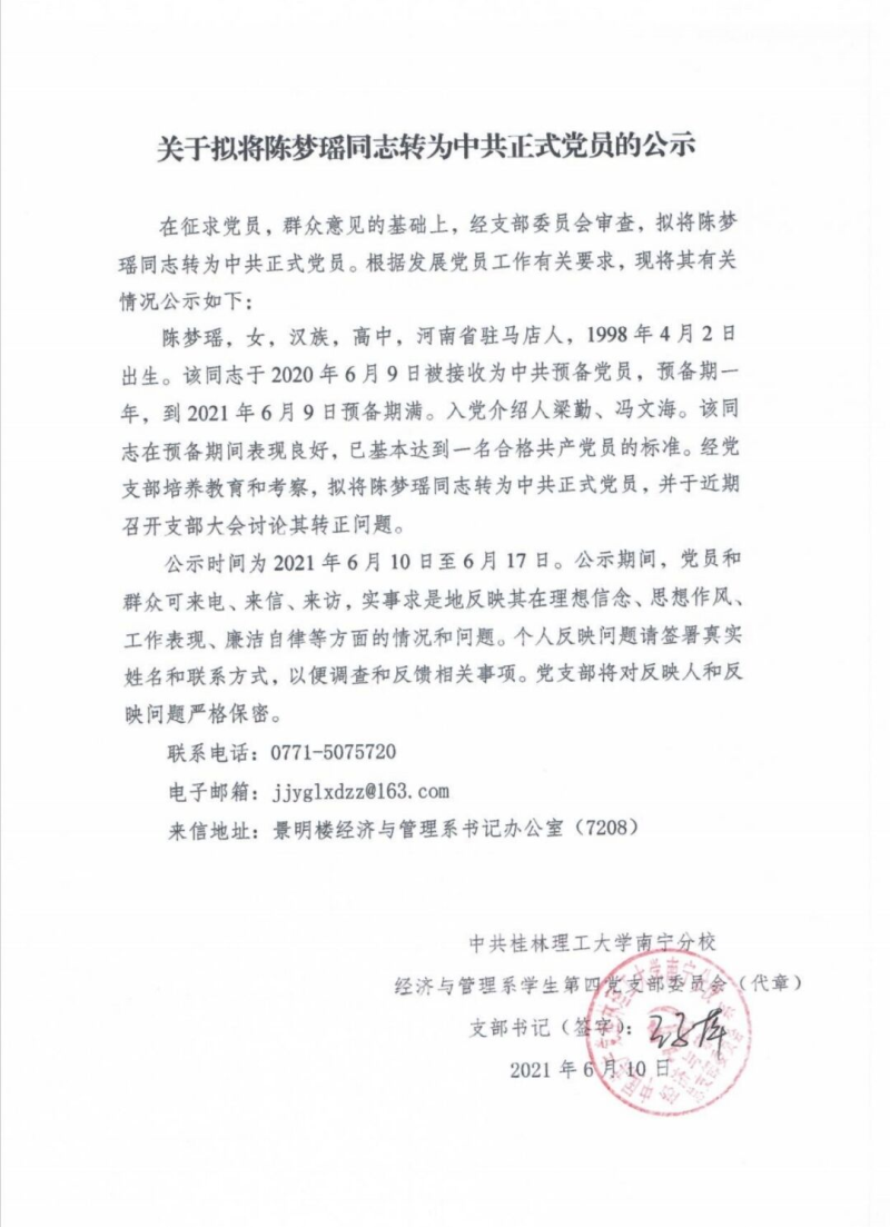 关于拟将陈梦瑶同志转为中共正式党员的公示