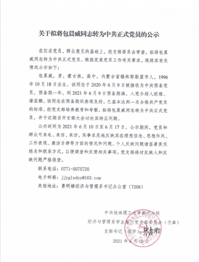 关于拟将包晨威同志转为中共正式党员的公示