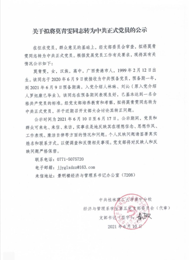 关于拟将莫青雯同志转为中共正式党员的公示