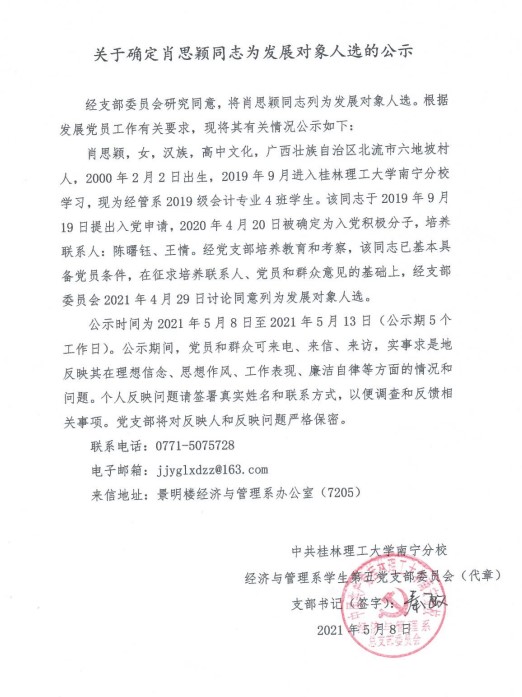 经济与管理系学生第五党支部关于确定肖思颖同志为发展对象入选的公示