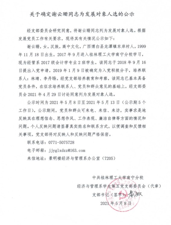 经济与管理系学生第五党支部关于确定谢云珊同志为发展对象入选的公示