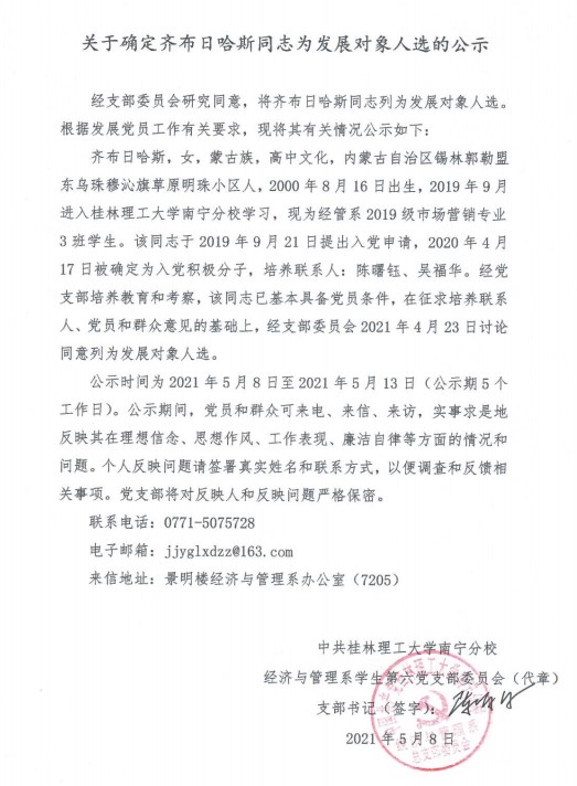 经济与管理系学生第六党支部关于确定齐布日哈斯同志为发展对象入选的公示
