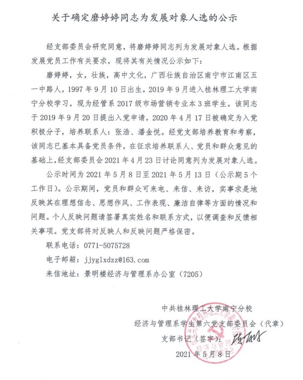经济与管理系学生第六党支部关于确定磨婷婷同志为发展对象入选的公示