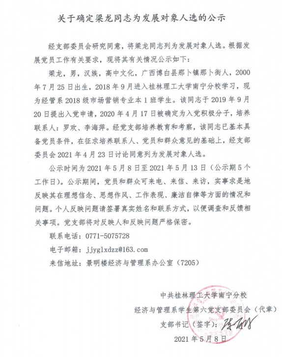 经济与管理系学生第六党支部关于确定梁龙同志为发展对象入选的公示
