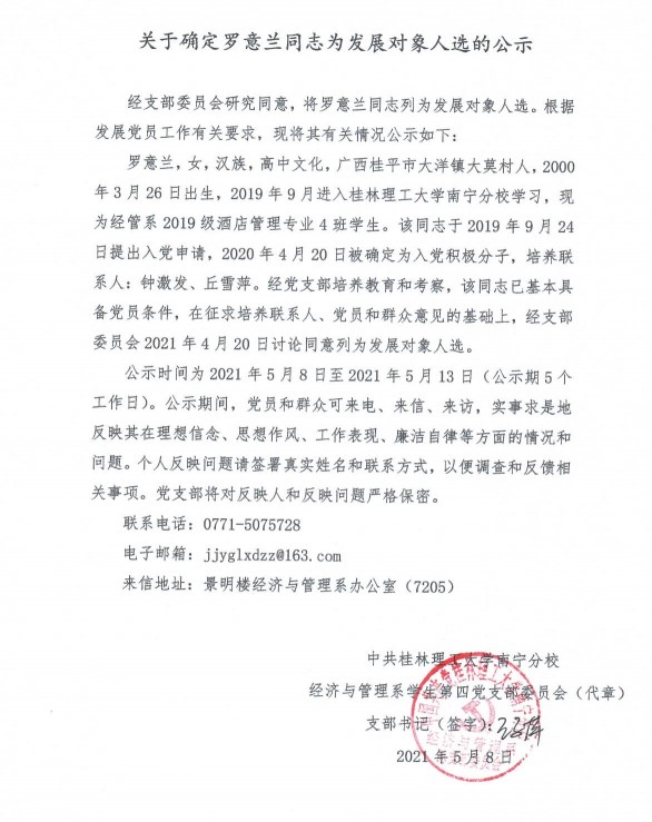 经济与管理系学生第四党支部关于确定罗意兰同志为发展对象入选的公示
