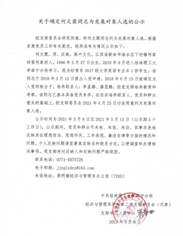 经济与管理系学生第二党支部关于确定何文霖同志为发展对象入选的公示