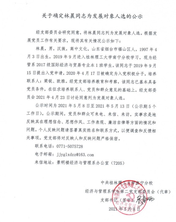 经济与管理系学生第二党支部关于确定林晨同志为发展对象入选的公示