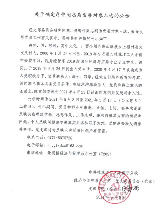 经济与管理系学生第二党支部关于确定蒋伟同志为发展对象入选的公示