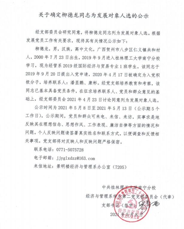 经济与管理系学生第二党支部关于确定柳德龙同志为发展对象入选的公示